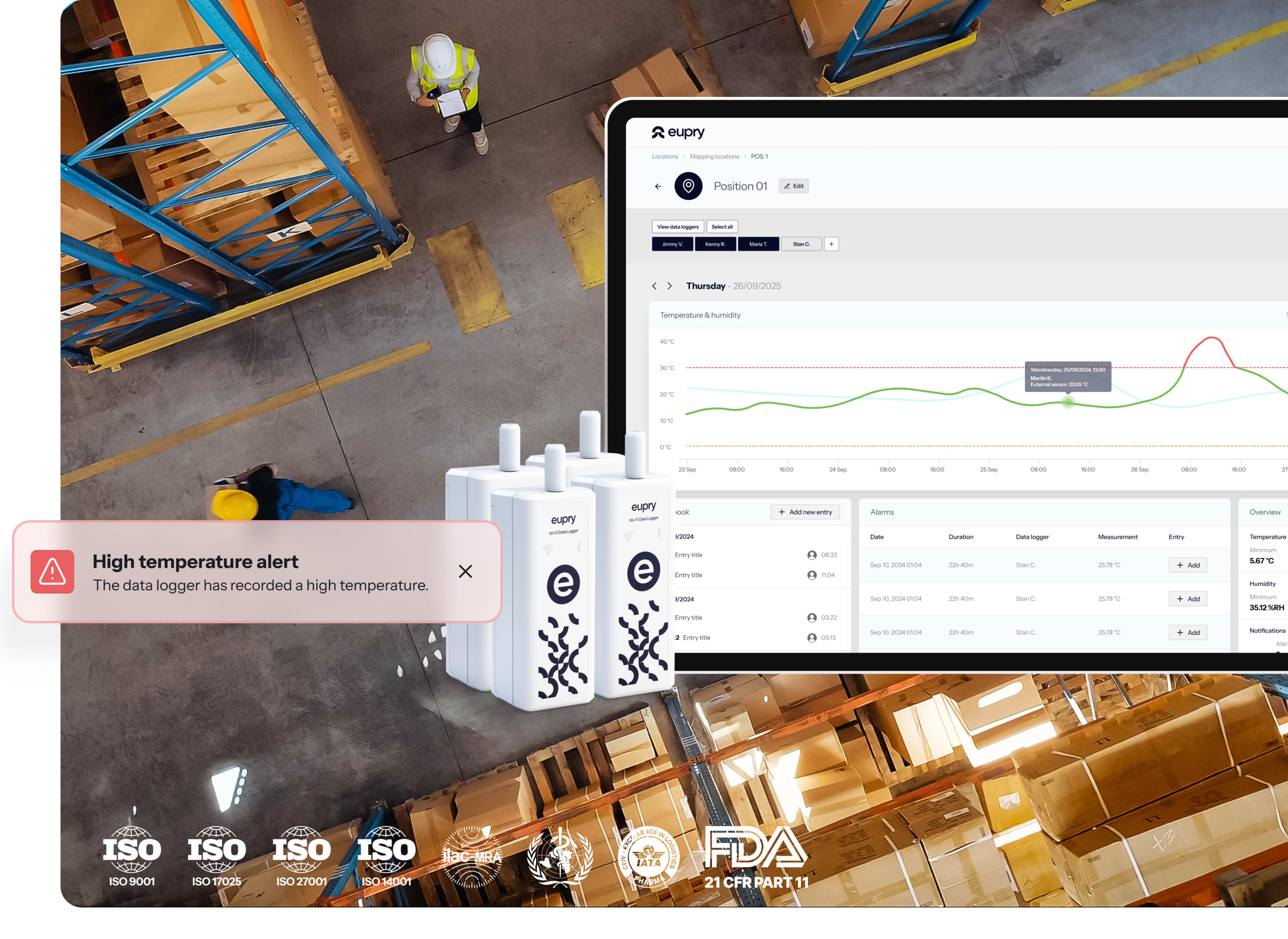 Eupry delivers complete warehouse GxP compliance from one provider. Wireless mapping and monitoring covers all zones with automated alerts and real-time visibility. Digital mapping validates faster with less downtime. On-site accredited calibration happens in seconds. One platform, single source of truth, globally.